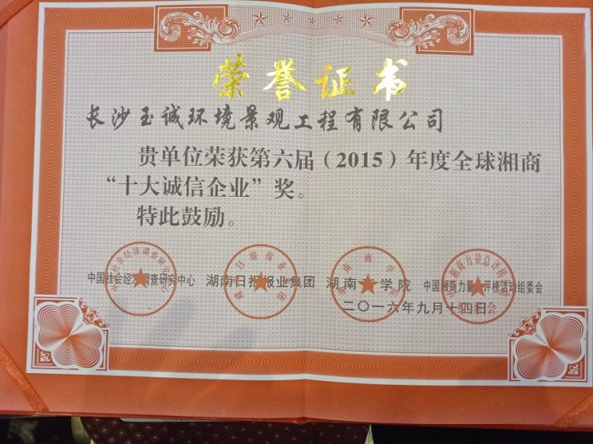 第六屆中國湘商力量總評榜活動于今年3月16日在長沙啟動,經(jīng)申報推薦、調(diào)研考察、初選入圍,提名公示、網(wǎng)絡(luò)投票、專家評審,長沙玉誠環(huán)境景觀工程有限公司成功榮膺 “全球湘商十大誠信企業(yè)”。