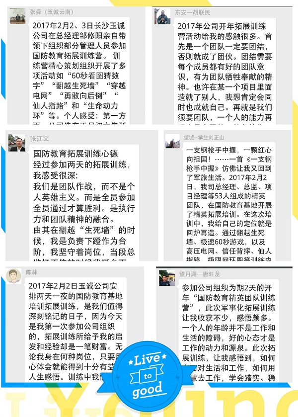堅持優良傳統,堅信“培訓是送給員工最好的禮物”,開年之初,玉誠精英管理團隊齊聚國防教育基地,開展為期兩天一晚的封閉式拓展培訓,此次培訓旨在培養激情、高效的團隊作風,提升企業凝聚力、執行力和協作力。